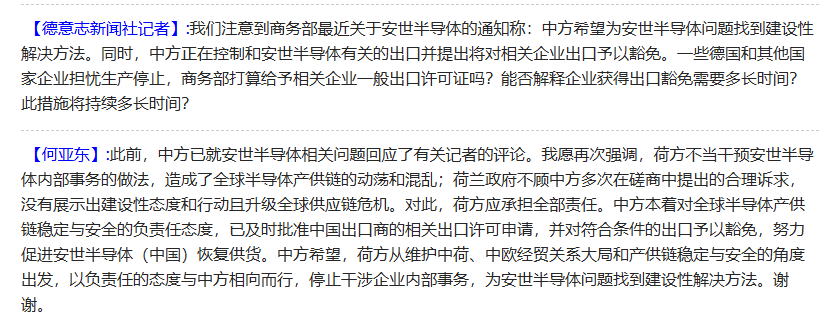 商务部重申,中方希望,荷方从维护中荷、中欧经贸关系大局和产供链稳定与安全角度出发,以负责任的态度与中方相向而行,停止干涉企业内部事务,为安世半导体问题找到建设性解决方法。